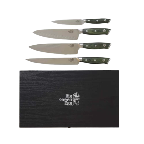 Deze set bestaat uit vier hoogwaardige messen die elke keukenklus moeiteloos klaren. De set is vervaardigd van premium Duits roestvast staal met een hardheid van 54-58 HRC. De messen bestaan zijn uit één stuk gesmeed, waarbij de krop van de messen zorgt voor een goede balans. Elk mes is voorzien van een Big Green Egg-logo op een groen houten handvat. De set is verpakt in een giftbox waarin je de messen kunt bewaren.