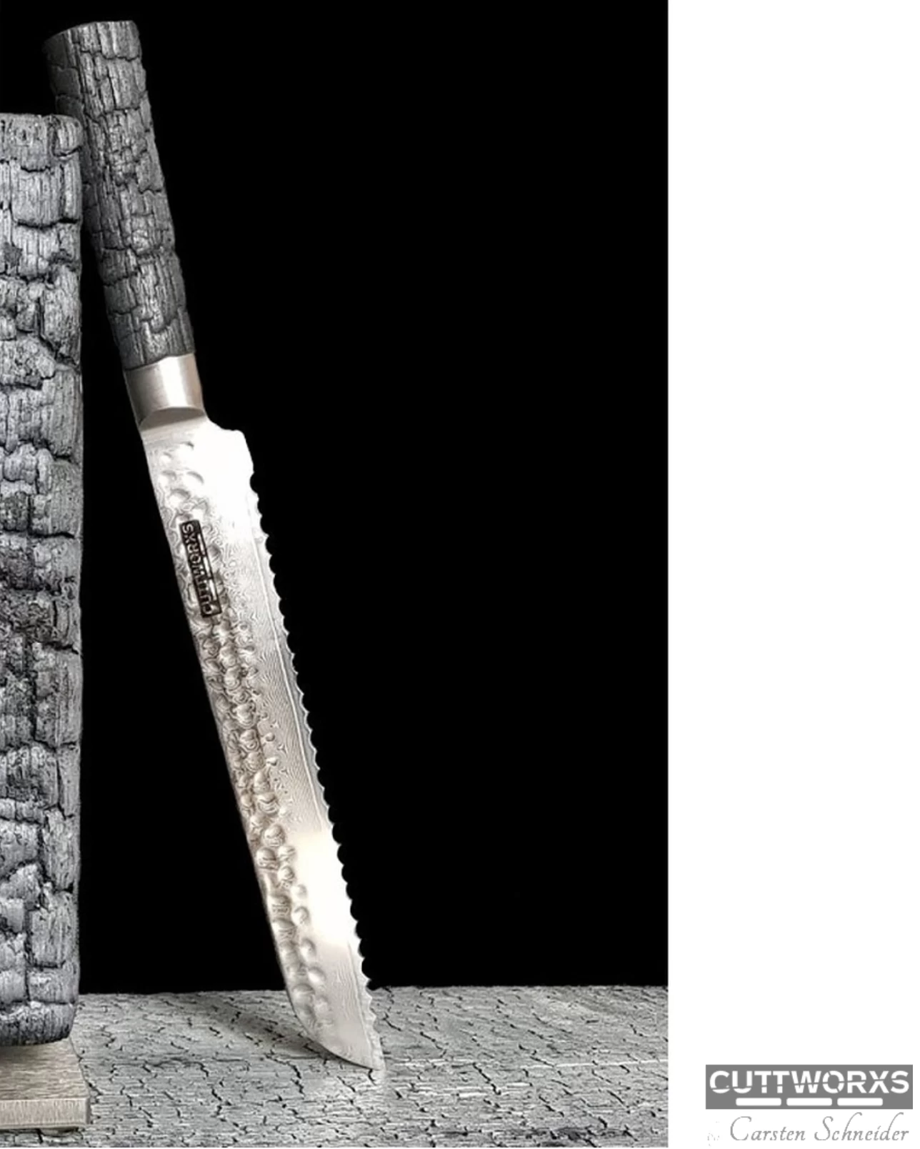 Cuttworxs brood mes geniet een zeer speciaal ontwerp. Het vlijmscherpe gekartelde lemmet van dit mes springt in het oog door zijn bijzondere vormgeving. Het gehamerde lemmet, de fijne damaststructuren en tenslotte het met FlameWOOD® gepatenteerde handvat van gebrand hout maken dit mes uniek. Zoals alle Cuttworxs messen ligt het Brood mes perfect in de hand en zorgt het voor de perfecte snede.