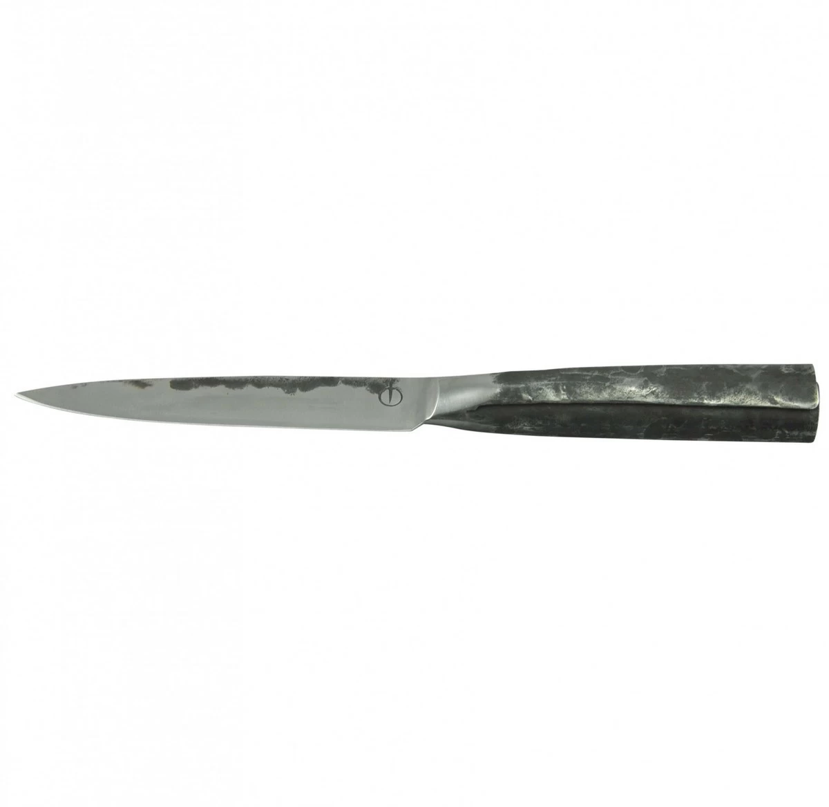 Het handvat is gemaakt van omgebogen roestvrij staal. Ondanks de grove afwerking en het ruige uiterlijk is het mes vlijmscherp en ligt het voortreffelijk in de hand.