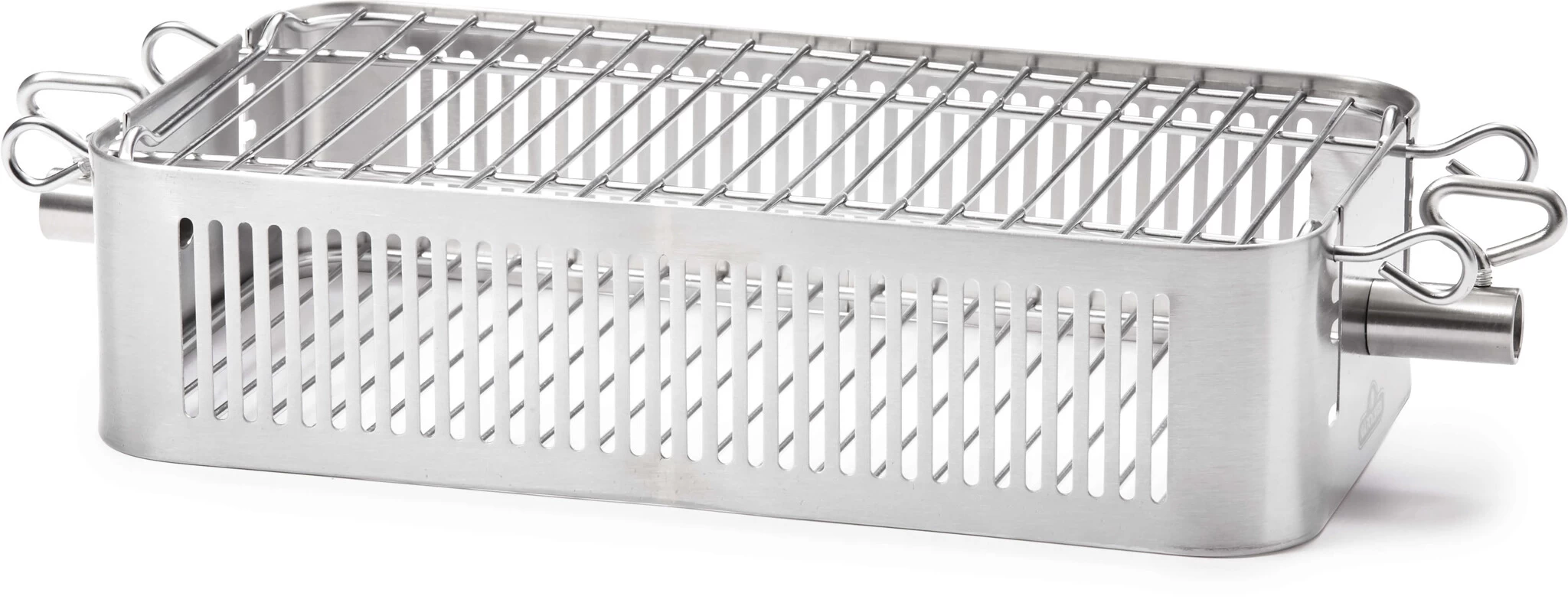 De verstelbare RVS mand voor het draaispit is perfect voor het bereiden van sparibs, roast en lamsrack, maar ook voor het bereiden van grote stukken groenten. De RVS maand is instelbaar op 4 niveaus. Dit accessoire past op het vierkante- en zeshoekige draaispit. De RVS mand is eenvoudig te reinigen met zowel de hand als in de vaatwasser.