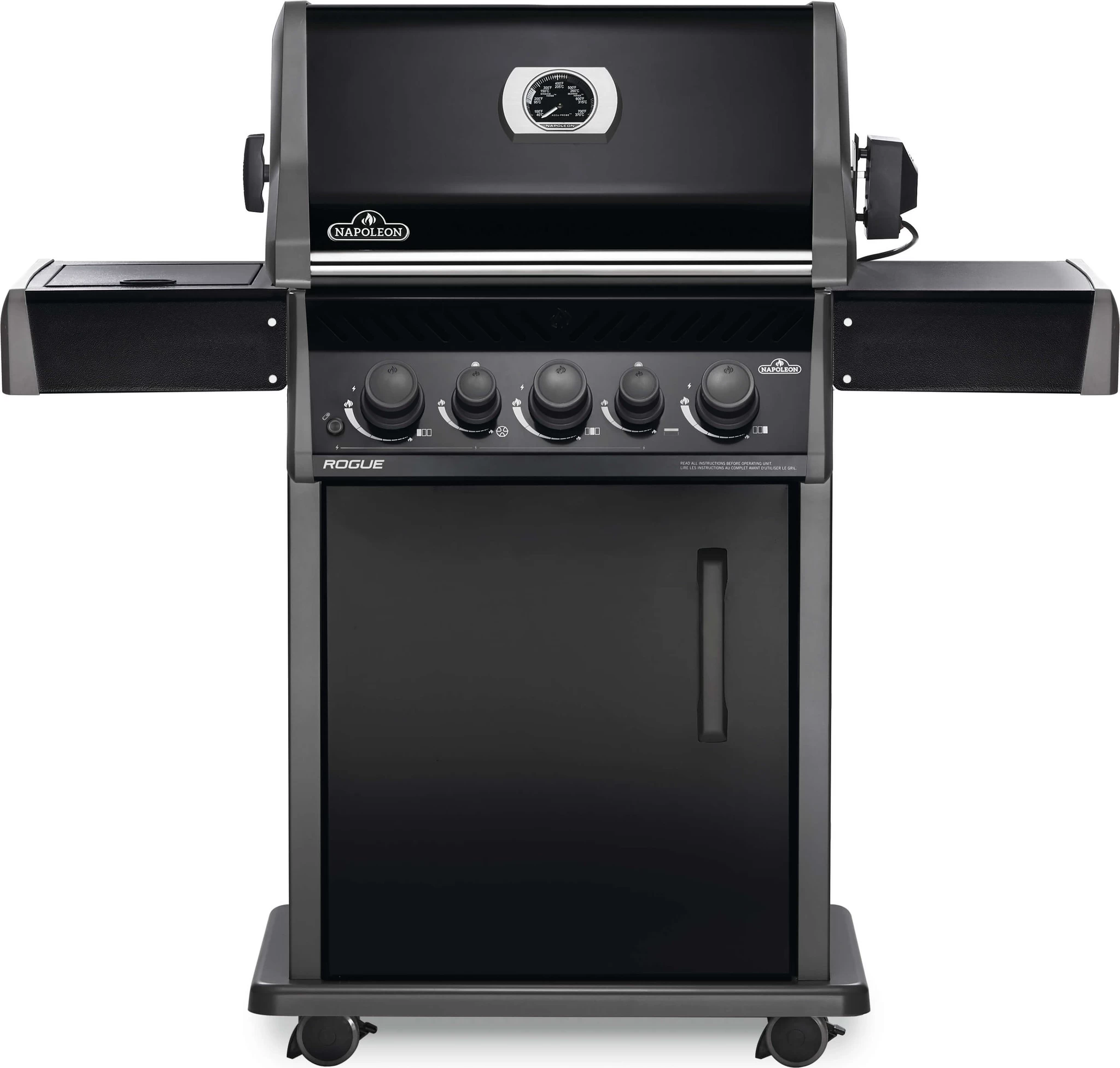 Zeg vaarwel tegen saaie tuinfeesten met de zwarte Rogue® 425 gasbarbecue van Napoleon met zijbrander. Aanzetten van malse seizoenslekkernijen is makkelijker dan ooit op onze iconische Wave rvs-grillroosters. De drie rvs-branders leveren warmte precies waar het nodig is, terwijl de op twee hoogtes geplaatste rvs-warmteverdelers het druipvet verdampen voor een intense grillsmaak. Bereid heerlijke gerechten voor jezelf of de hele buurt op een grilloppervlak van wel 60 × 45 cm. Sauzen en bijgerechten zijn een fluitje van een cent met de aparte geïntegreerde zijbrander. Deze barbecue met gemakkelijk te onderhouden zwart porseleinen deksel, enkelvoudige deur en geïntegreerde opslagruimte past in elk buitendecor. Dankzij de vergrendelbare wieltjes in het voetstuk rijd je de barbecue zo overal naartoe. Met de inklapbare rvs-zijtafels kun je de Rogue compact opbergen. Geen andere barbecue biedt zó veel veelzijdigheid en hoogwaardige componenten tegen een betaalbare prijs.