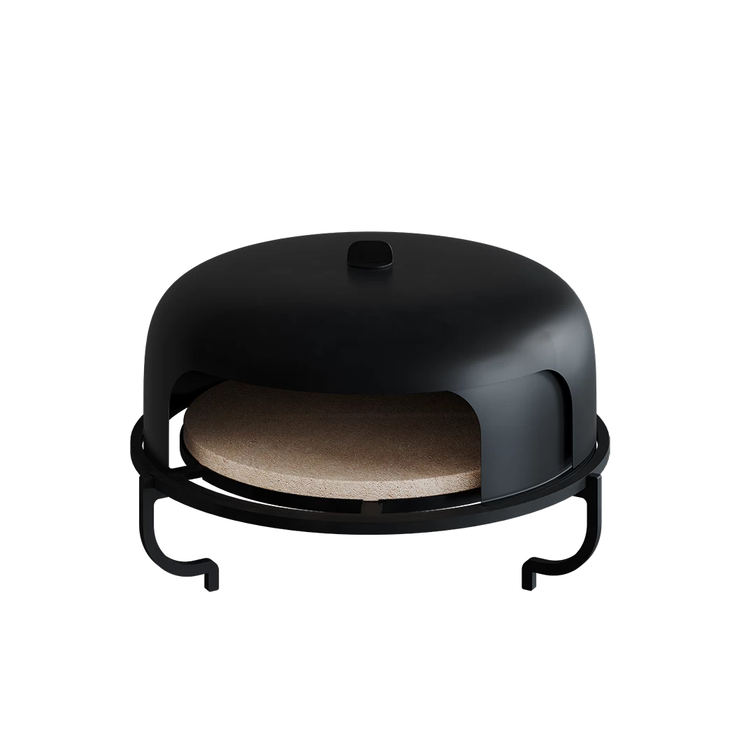 In de gietijzeren plaat zitten openingen waardoor de hitte uit het OFYR kooktoestel in de cloche kan circuleren en de pizza snel verhit. Door de knop op de cloche te draaien kan je de grootte van de opening tussen de binnenste- en buitenste cloche bepalen. Hoe groter de opening, des te meer luchtcirculatie en des te meer hittevorming.