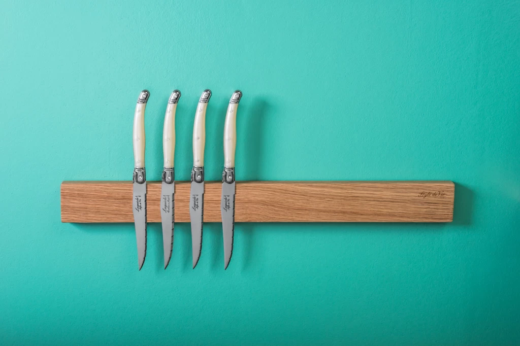 Deze magneetstrip van Style de Vie is verkrijgbaar in een Eikenhout of walnoot uitvoering. De magneetstrip heeft een lengte van 50cm en biedt plek voor circa 10 messen (afhankelijk van het type mes). De magneetstrip kan met twee schroeven (meegeleverd) worden bevestigd.Â