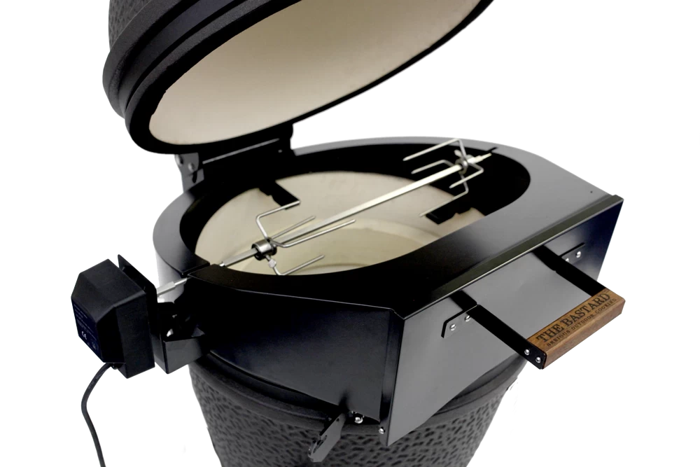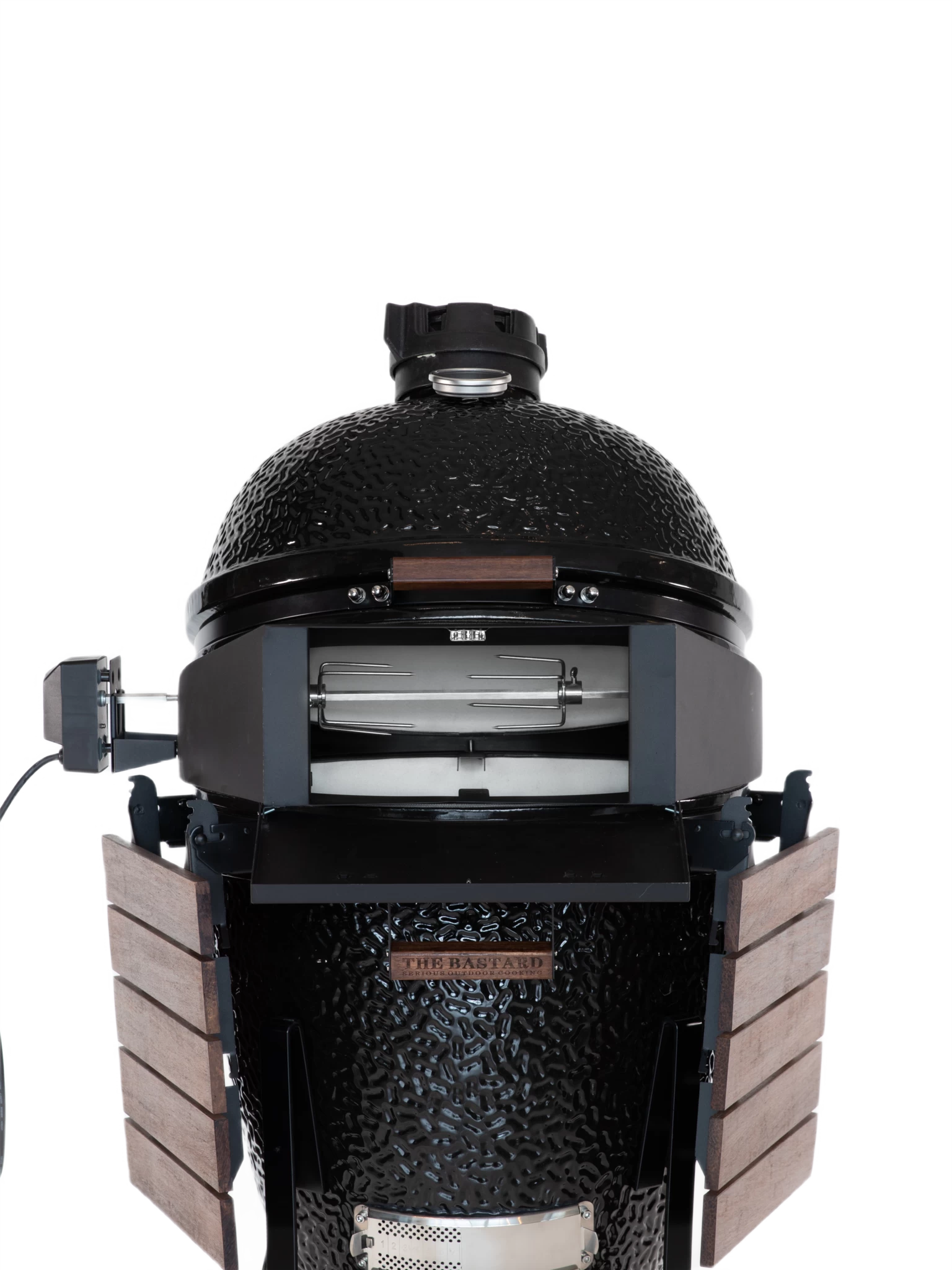 De Bastard rotisserie verzekert niet alleen de perfecte grill door voorzichtig roterend voedsel boven het vuur, het transformeert je kamado in de perfecte pizzaoven. De deksel blijft gesloten, je kunt het deurtje openen en je pizza er super makkelijk met de pizza schep in schuiven zonder warmte te verliezen!